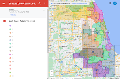 The Cook County Clerk will issue maps of each subcircuit soon -- probably in June, according to the best information that FWIW has been able to determine -- but that doesn't mean that the boundaries of the redrawn subcircuits are not yet known. They are known, and have been known, since January 2022. This map, an interactive version of which is presently available via the Cook County Clerk's website, shows the boundary lines: